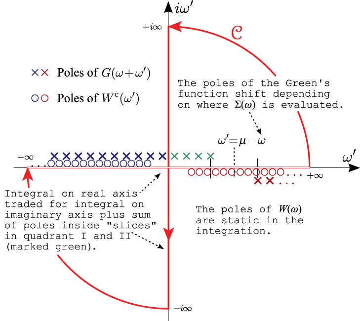 \[\begin{equation} \label{eq:GW_CD} \Sigma_c(\ww) = \dfrac{i}{2\pi} \Bigl\{ 2\pi\,i \sum_{z_p}^\mcC \lim_{z\rightarrow z_p} G(z)\,{W}^{\text{c}}(z)\,(z-z_p) -\int_{-\infty}^{+\infty} G(\ww+i\ww')\,{W}^{\text{c}}(i\ww') \dd(i\ww') \Bigr\}. \end{equation}\]