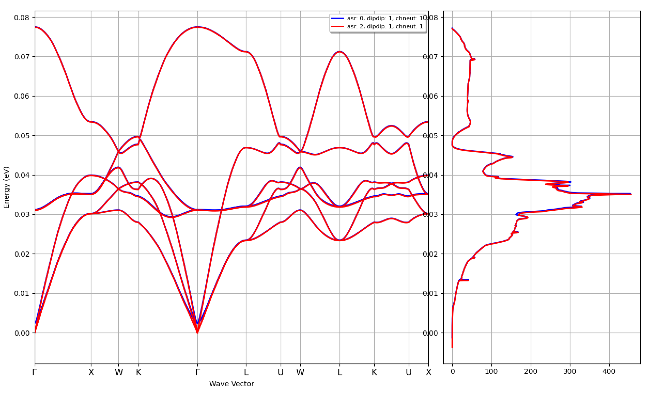 Note that several parameters have been tuned to reach a reasonable compromise between accuracy and computational cost so do not expect the results obtained at the end of the lesson to be fully converged. More specifically, we use norm-conserving pseudopotentials with a cutoff energy ecut of 30 Ha (too low, it should be ~45 Ha). The DFPT computations is done for the set of irreducible \(\qq\)-points corresponding to a \(\Gamma\)-centered 3x3x3 \(\qq\) mesh (again, too coarse, it should be 6x6x6 for ab initio \(\mathbf{k/q}\)-meshes). \(\bm{Z}^*\) and \(\bm{\ee}^\infty\) are also computed with the same underconverged settings.