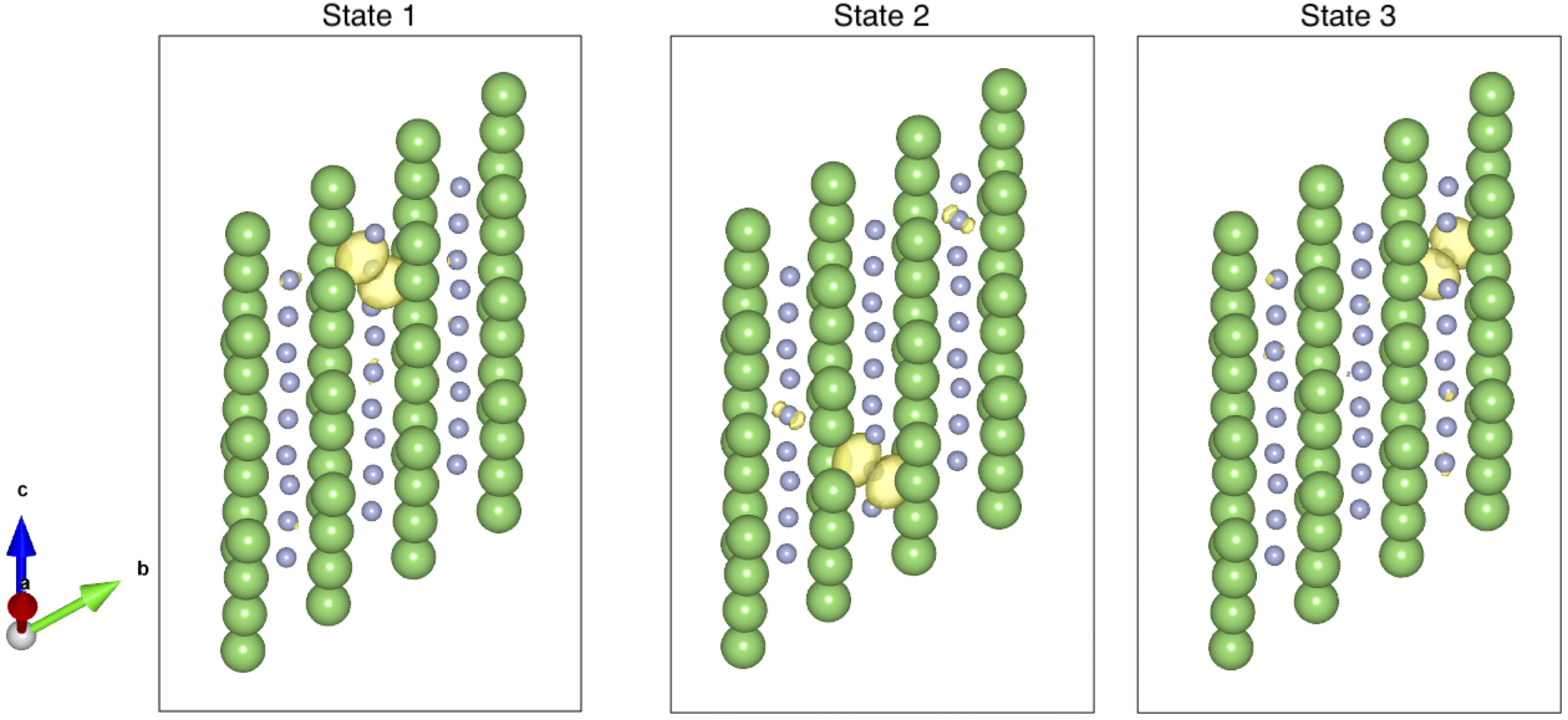 One can use software that can read .xsf file format (e.g. VESTA) to visualize these outputs. The following figure shows the charge distribution of each polaronic state: