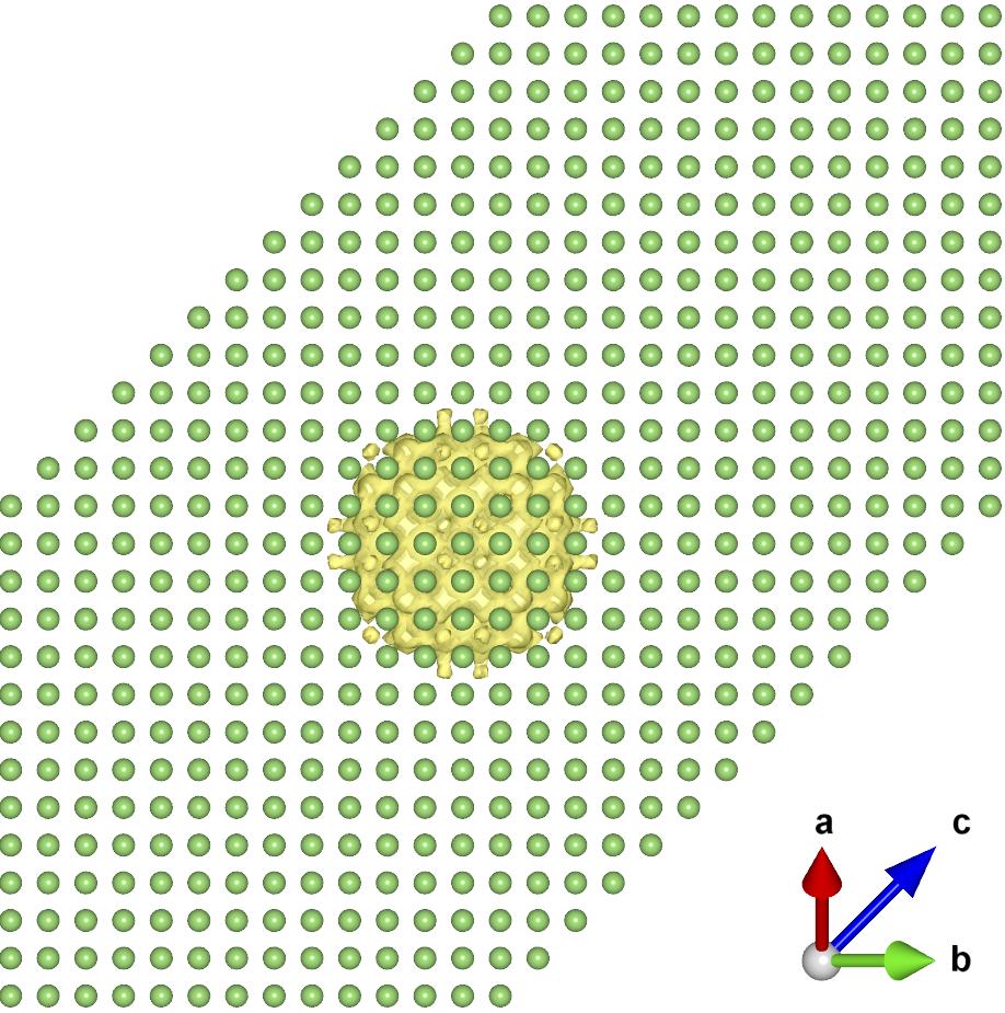 This produces usual *xsf files that can be used for viauslization. If we open teph4vpq_10o_pstate_1_POLARON.xsf in VESTA, the following charge distribution can bee seen: